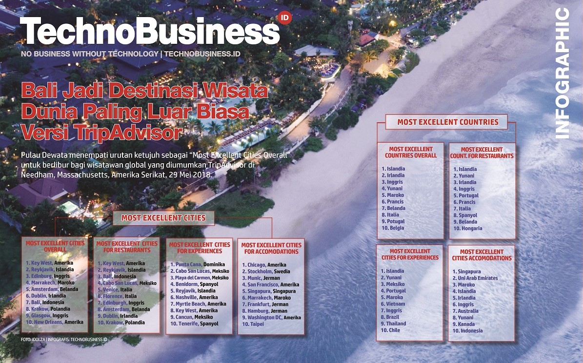 TechnoBusiness Infographic ● Bali menempati urutan ketujuh sebagai “Most Excellent Cities Overall” untuk berlibur bagi wisatawan global yang diumumkan situs perjalanan terbesar di dunia TripAdvisor, Inc. (Nasdaq: TRIP) di Needham, Massachusetts, Amerika Serikat, 29 Mei 2018.