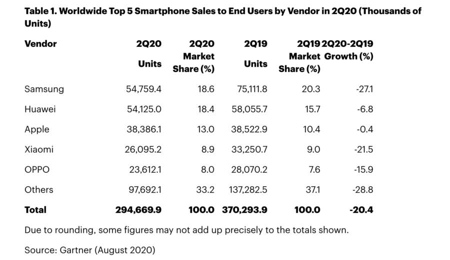 Berdasarkan penghitungan periset pasar Gartner, penjualan ponsel pintar global pada kuartal 2/2020 justru turun 20,4% dibanding periode yang sama tahun lalu menjadi 294,6 juta unit.