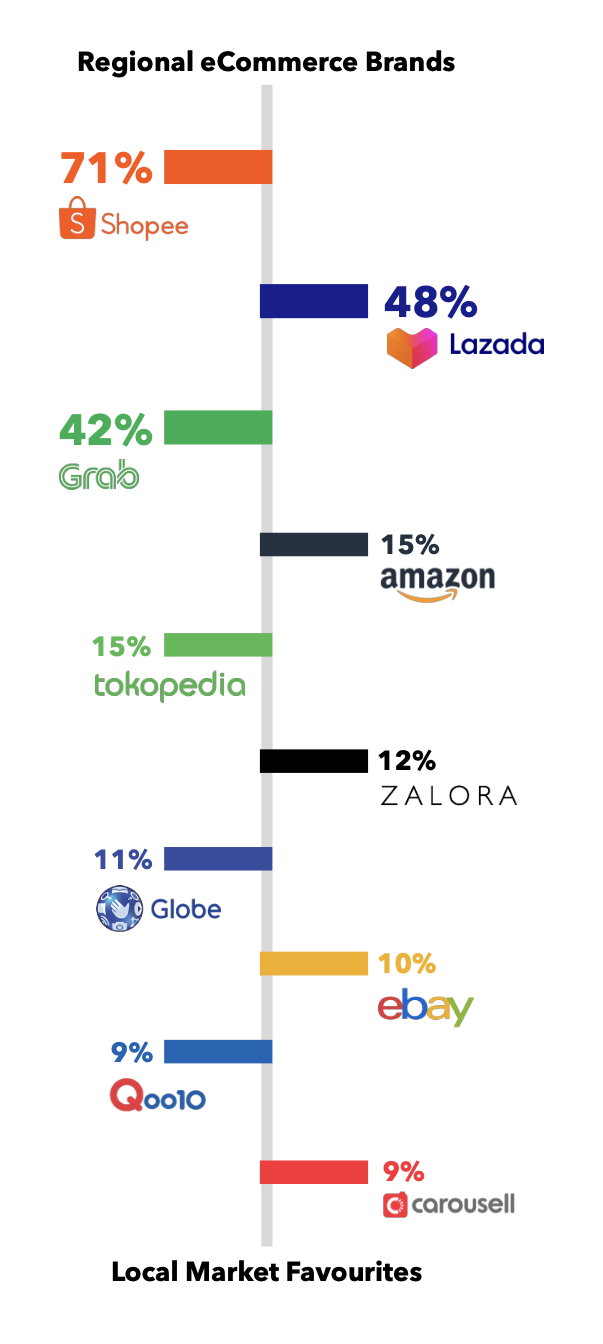 E-commerce paling populer kedua disandang oleh Lazada (48%). Lazada, yang sahamnya dikuasai oleh Alibaba Group asal China, cukup memainkan peran di Thailand (62%), Malaysia (60%), dan Filipina (59%).