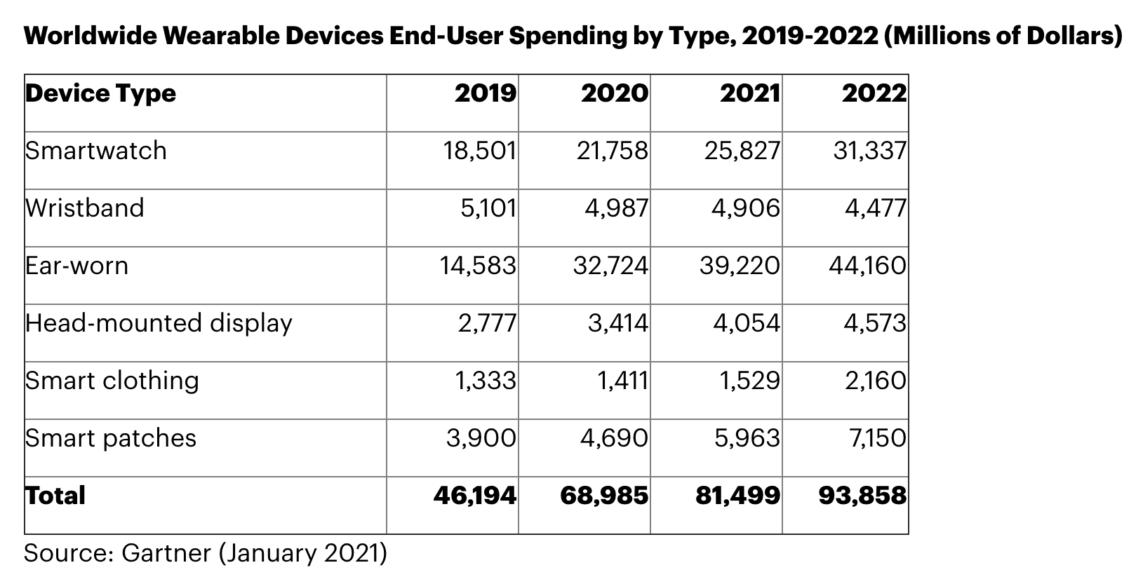 Selama 2020, perangkat ear-worn dan smartwatch mengalami pertumbuhan yang sangat kuat karena konsumen mengandalkan perangkat-perangkat itu untuk pekerjaan jarak jauh dan pelacakan kesehatan.