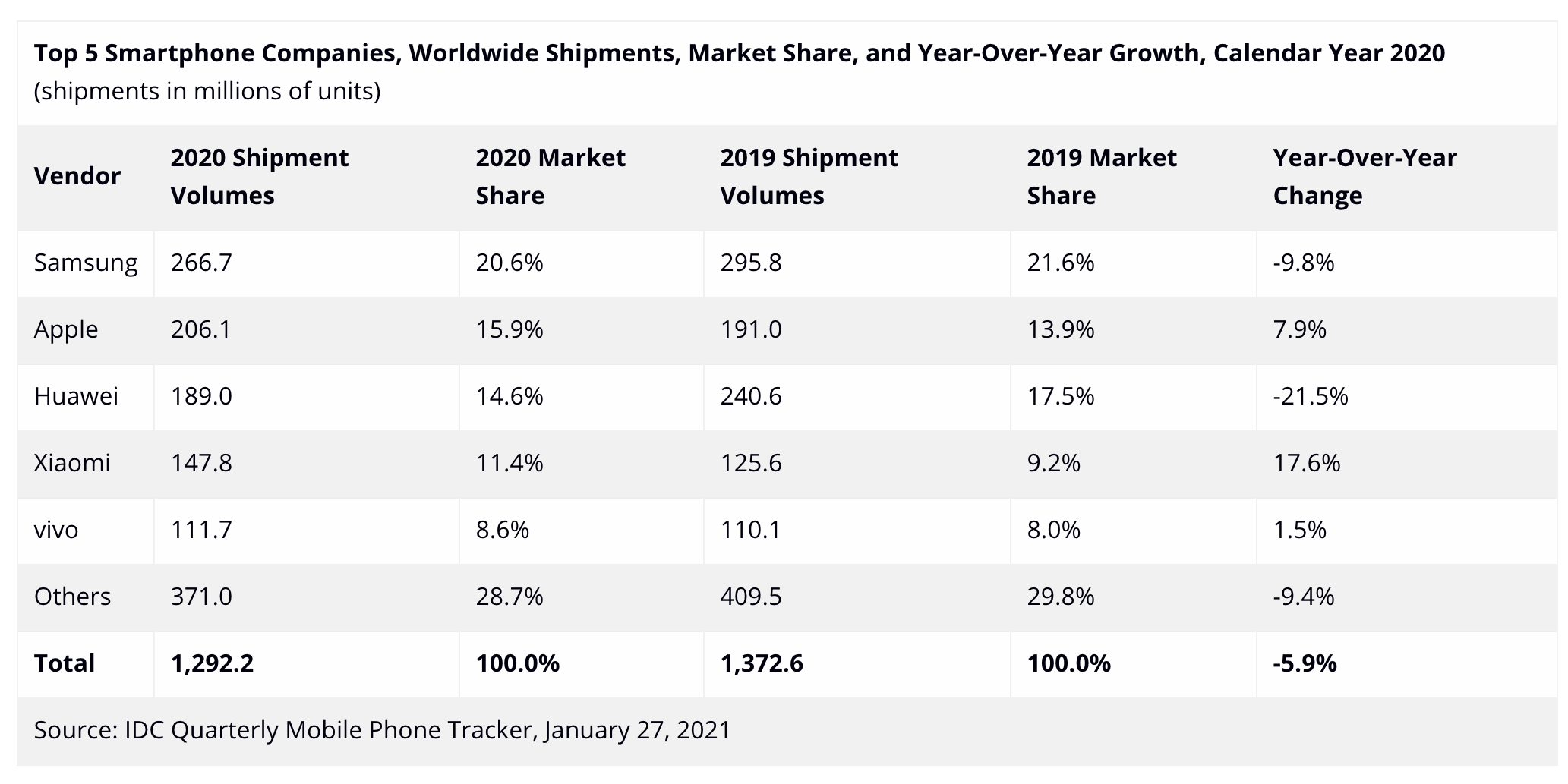 Berdasarkan data periset pasar IDC, selama kuartal 4/2020 vendor-vendor mengirimkan produknya ke pasar ponsel pintar global sebanyak 385,9 juta unit. Jumlah itu lebih banyak dibanding 369,9 juta yang dikirimkan pada kuartal 4/2019.