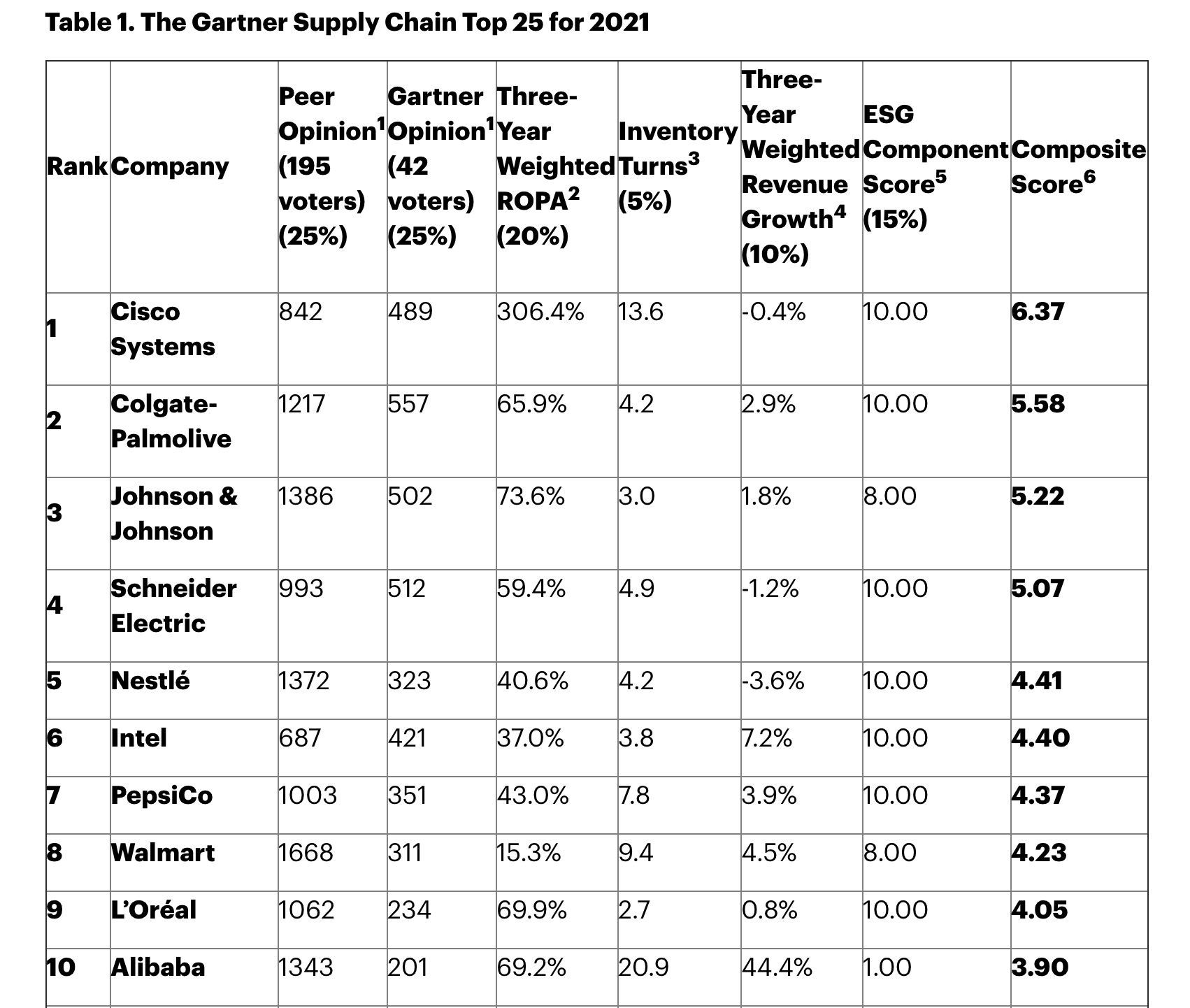 Dari daftar 25 Top Perusahaan Rantai Pasok Global 2021 tersebut, Cisco Systems menduduki posisi teratas yang diikuti oleh Colgate-Palmolive dan Johnson & Johnson.