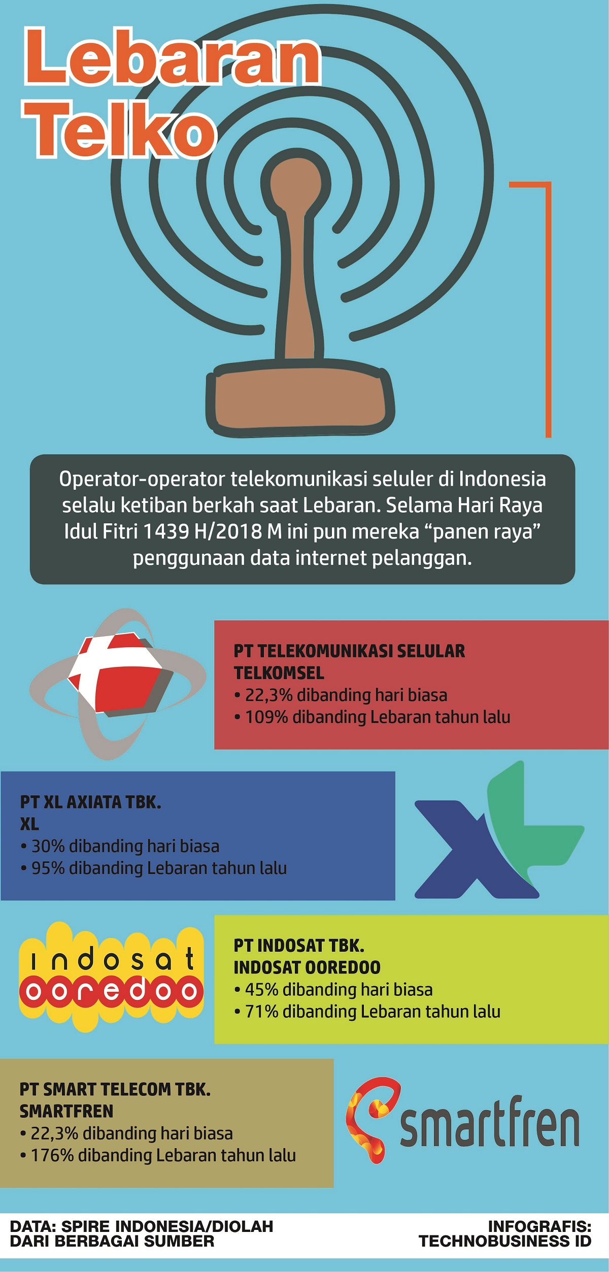 PT Telekomunikasi Selular (Telkomsel), operator telekomunikasi seluler terbesar di Tanah Air di bawah naungan PT Telekomunikasi Indonesia Tbk., misalnya, selama Lebaran 2018 mengalami lonjakan trafik data 22,3% dibanding hari biasa dan 109% dibanding Lebaran 2017.