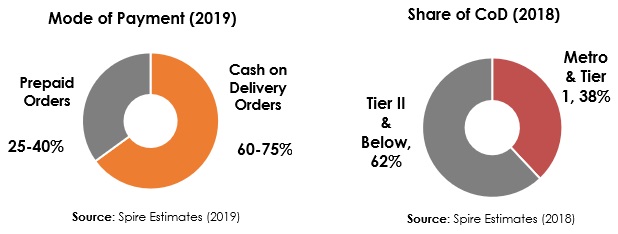 COD adalah mode pembayaran yang disukai oleh pembeli online di India. Sekitar 60-75% dari semua pesanan pada 2019 merupakan pesanan COD, terutama di kota-kota tingkat dua dan di bawahnya di mana terdapat kekurangpercayaan dan penetrasi rendah dari mode pembayaran online.