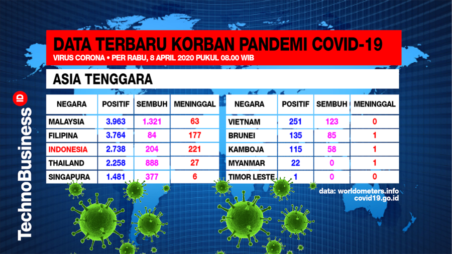 TechnoBusiness Corona Update ● Inilah daftar 10 negara Asia Tenggara yang terjangkit pandemi virus Corona (Covid-19) per Rabu (8/4) jam 8 pagi WIB.